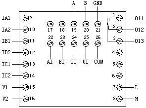 IA1、IA2、IB1、IB2、IC1、IC2是检测A、B、C相电流的信号接线端子,L、N是电动机保护器AC 220V工作电源的接线端子,O11、O12是电动机保护器内部继电器触点的接线端